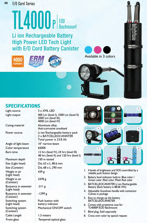 Was den TL4000P auf dem Markt auszeichnet, ist seine Kombination aus Zuverlässigkeit, Vielseitigkeit und Hochleistungsfunktionen, was ihn zu einem unverzichtbaren Werkzeug für jeden macht, der es ernst meint mit Unterwasserabenteuern. Egal, ob Sie durch Höhlen navigieren oder einen Nachttauchgang genießen, diese Kanisterleuchte sorgt dafür, dass Sie sehen und gesehen werden.